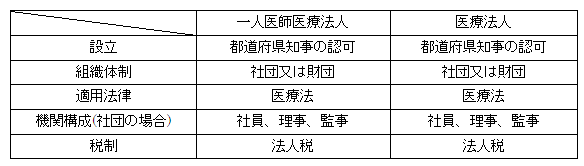 医療法において、一人医師医療法人を特別に規定している条項はありません。すなわち、法律上では一人医師医療法人と他の医療法人とは同じ存在・同じ意味を有しています。違いとしては、常勤の勤務医が一人又は二人であることのみです。