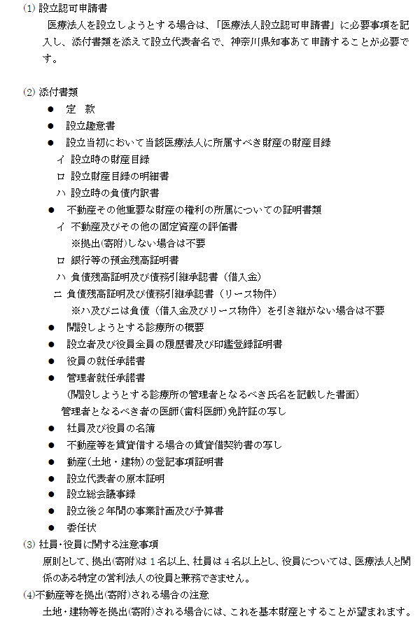 一人医師医療法人の設立に際して提出する書類は多岐にわたります。また、定款又は寄附行為を作成する事(法定記載要件があります)、厚生労働省が定めている構造基準、人員配置基準(省令)をクリアする必要もあります。事前の準備が不可欠となります。