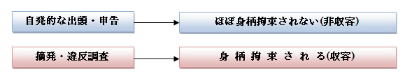 自主出頭(在宅案件)の場合は、収容令書の発行と同時に仮放免されることがほとんどです。ただし、逃亡のおそれがあるなどの事情があれば、一度は収容される可能性があります。 自ら入国管理局に出頭した場合は、収容(身柄拘束)される可能性は低くなります。 ※自主出頭(在宅案件)だから必ず仮放免が認められるわけではありません