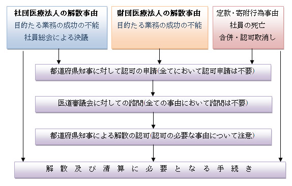 社団医療法人・財団医療法人の解散事由について都道府県知事の認可が必要な事由があります。医療法が定めた事由については、都道府県知事に対して認可の申請を行うことになります。大まかな流れは次のとおりです。
