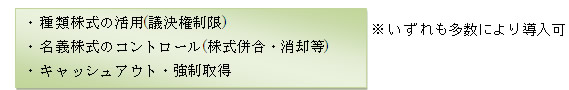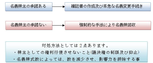 特に名義株主の承諾(念書及び承諾書)が得られない場合は、株主としの権利行使される可能性があります(株主としての権利意識高い)。まず、議決権を制限する(無議決権株式)に変更する、名義株式数を減少させる、一定の現金交付により追い出しを行うなどの手法が考えられます。