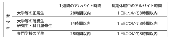 留学生・就学生に与えられる資格外活動の許可は、本来の活動の遂行を阻害しないと認められる場合に限り、また一般的にはアルバイト先が風俗営業または風俗関連営業が営まれている事業所に係る場合でないことを条件として、次のアルバイト可能時間一覧表の内容を限度として勤務先や時間帯を特定することなく包括的な資格外活動許可が与えられます。